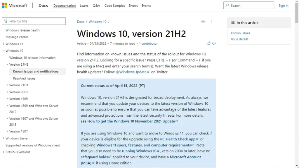 Microsoft, Windows 10 Sürüm Bilgileri web sitesinde Windows 10 sürüm 21H2 için bilinen hiçbir sorunu listelememektedir. Sayfada listelenen son iki bilinen sorunun ikisi de çözüldü olarak işaretlendi.