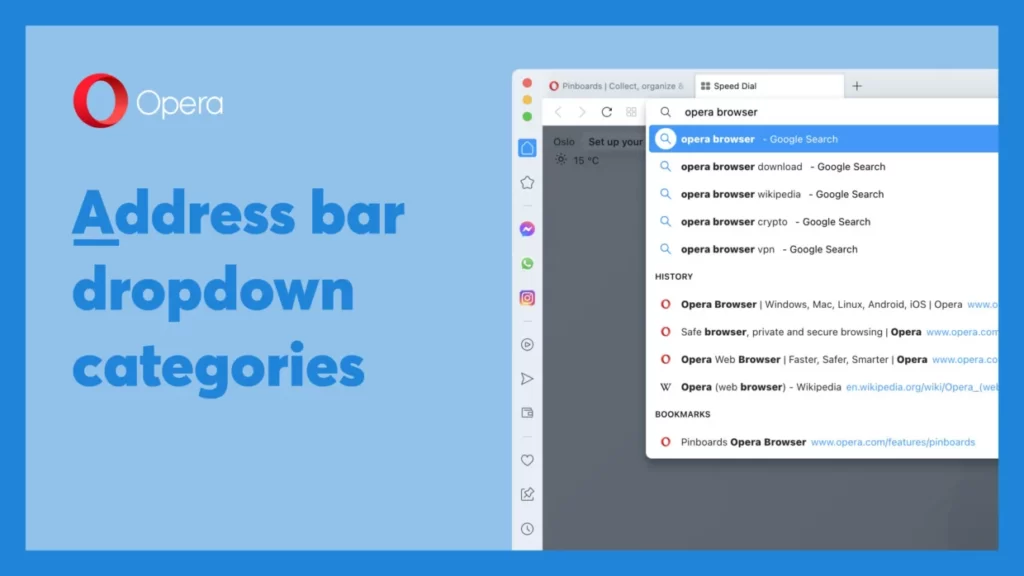 Opera, Adres Çubuğunun arama işlevini değiştirdi. bir şey yazdığınızda, açılan menü artık görüntülenen sonucun bir web araması mı, bir yer imi mi yoksa göz atma geçmişinizden bir öğe mi olduğunu gösterecek.