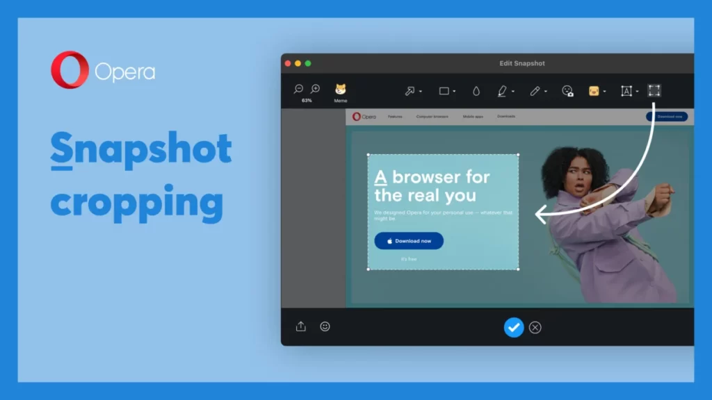 Opera’daki Anlık Görüntü düzenleyici, ekran görüntüsü aldıktan sonra görüntüleri kırpmak için kullanılabilecek yeni bir araca sahiptir. Bu, güzel bir ekran görüntüsünden düğmeler, kenarlıklar, YouTube arama çubuğu vb. gibi istenmeyen öğeleri düzenlemek için kullanışlı olabilir. Yeni düzenleme seçeneği düğmesi, araç çubuğunun sağ kenarında bulunur.