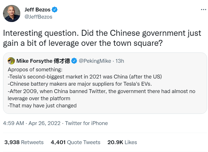 Jeff Bezos, Elon Musk’ın satın aldığı Twitter’ı merak ediyor. Twitter ve Elon Musk arasındaki yeni anlaşma ve bunun kullanıcıları ve diğer ülkeleri nasıl etkileyeceği konusundaki endişelerini dile getirdi Jeff Bezos, Musk’ın Twitter’ı satın almasının, geçmişte propaganda yaymak için Twitter reklamlarını kullanan Çin’e bir miktar avantaj sağlayıp sağlamayacağını bilmek istiyor.